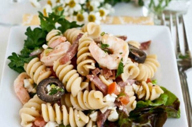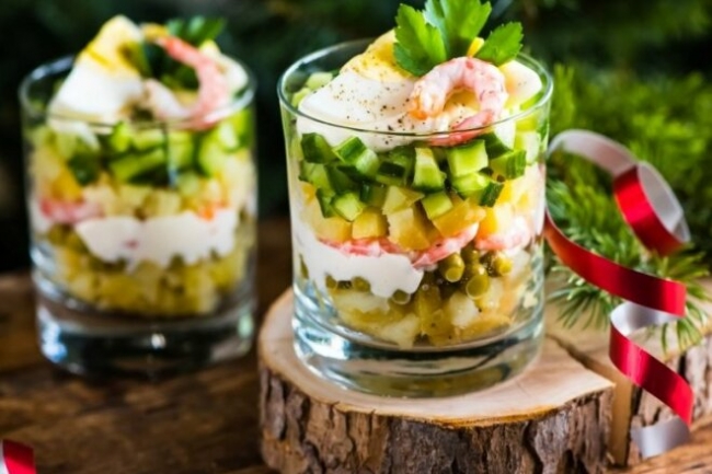 Этот рецепт — дерзкий гастрономический фьюжн. Сочетание «домашней» колбасы и «элитных» креветок превращает обычный Оливье в оригинальный коктейль. Формат салата-коктейля…